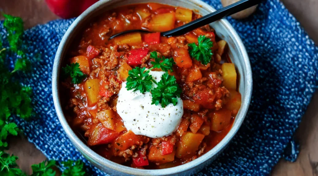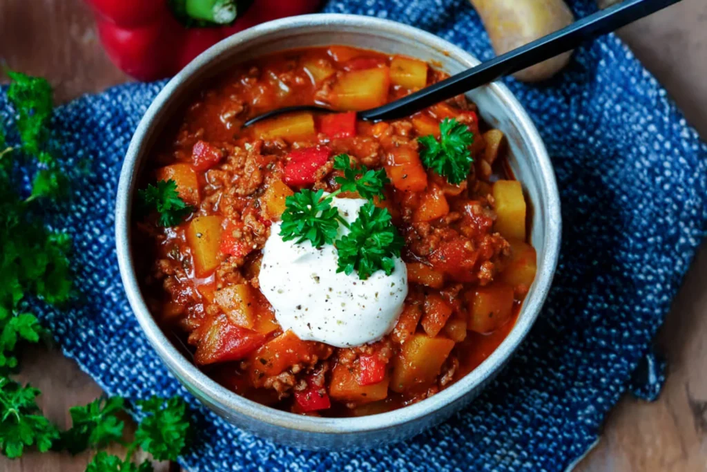 Die Kartoffelwürfel, die Rinderbrühe, die gehackten Tomaten, die Petersilie und das Paprikapulver in den Topf geben und alles 30 Minuten köcheln lassen. Den Bauerntopf mit Salz und Pfeffer abschmecken.