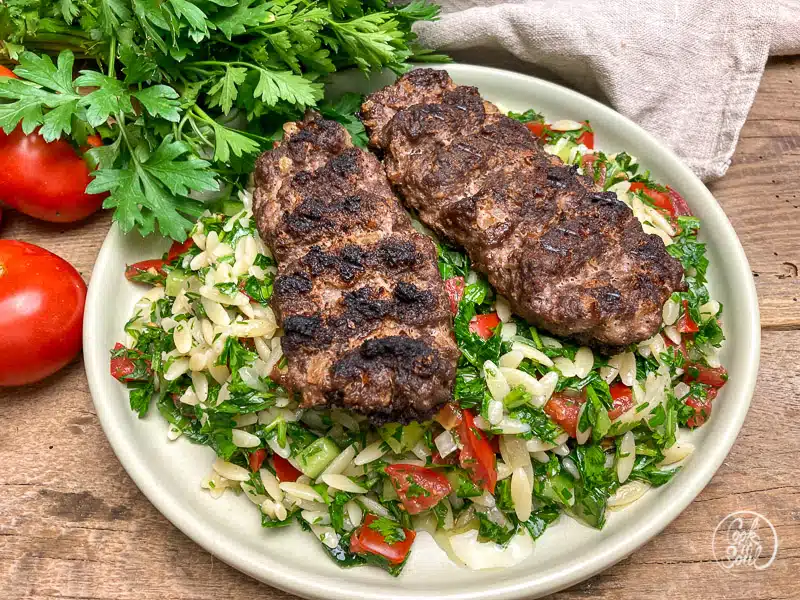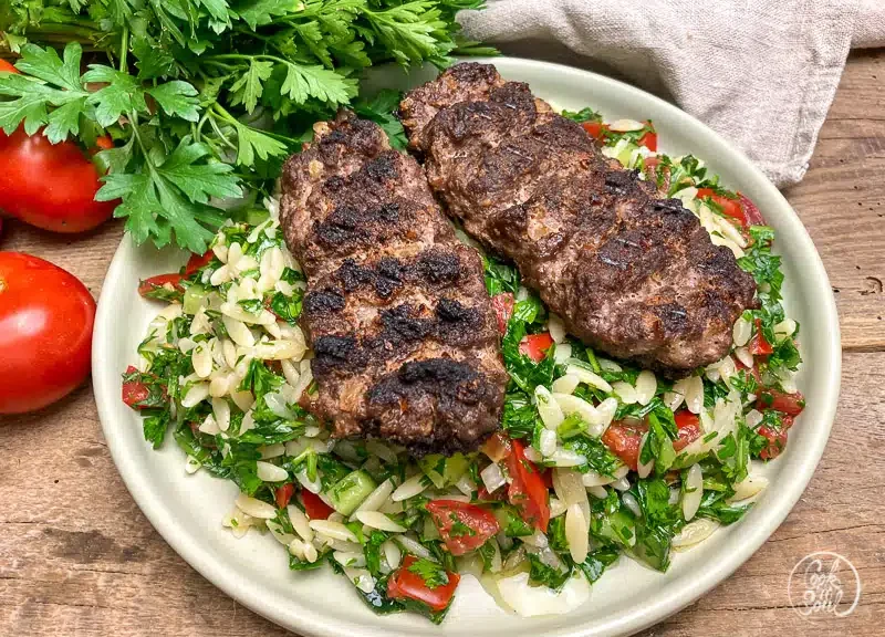 Aus der Hackfleischmasse Kugeln von jeweils ca. 75g formen und diese länglich um einen gewässerten Holzstab formen. am Ende leicht flach drücken. Bifteki auf den Grill oder in die Grillpfanne legen und von beiden Seiten ca. 2 bis 3 Minuten grillen, bis das Fleisch ordentlich Farbe und damit seine Röstaromen bekommen hat.
